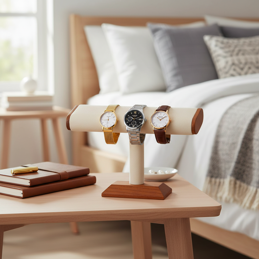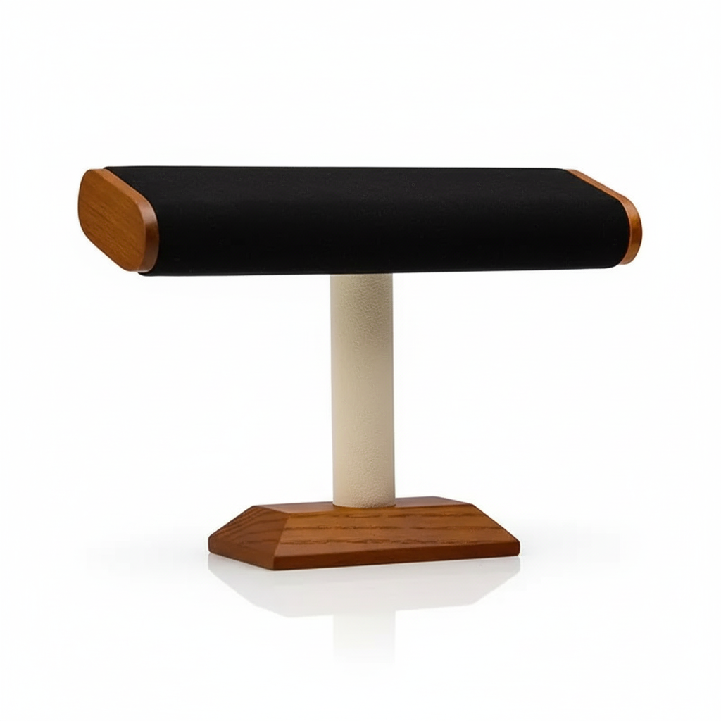 Coussin (ou support) : Forme en T ou en I (selon les images) recouverte de cuir synthétique premium ou de suédine, offrant un aspect lisse et raffiné pour accueillir la montre.