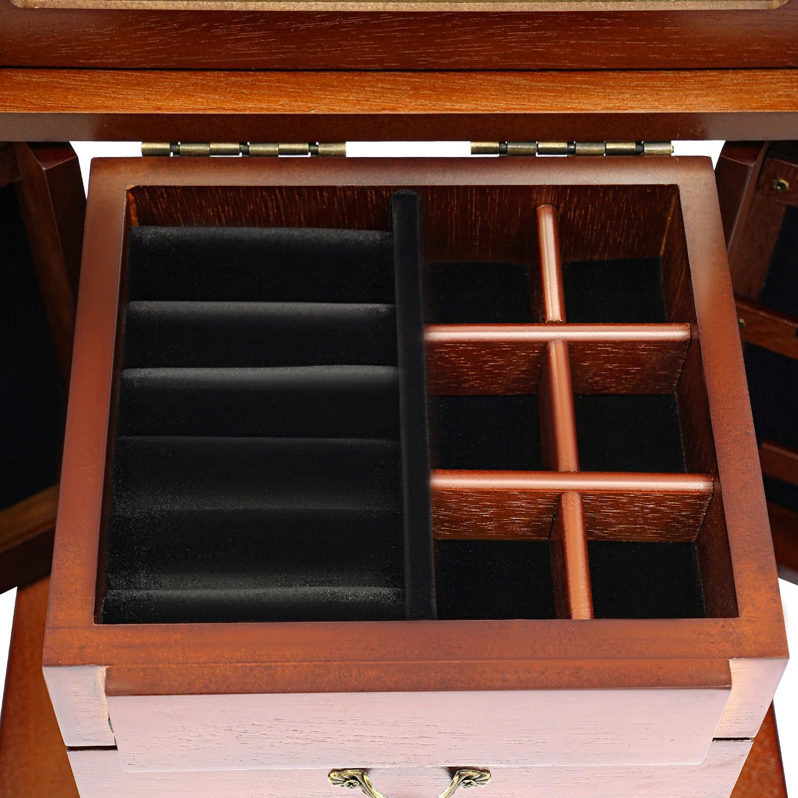Organisation Modulaire : Multiples tiroirs et compartiments de différentes tailles, ainsi que des portes latérales pour les colliers (si visible sur la photo), assurant une mise en valeur tridimensionnelle de la collection.